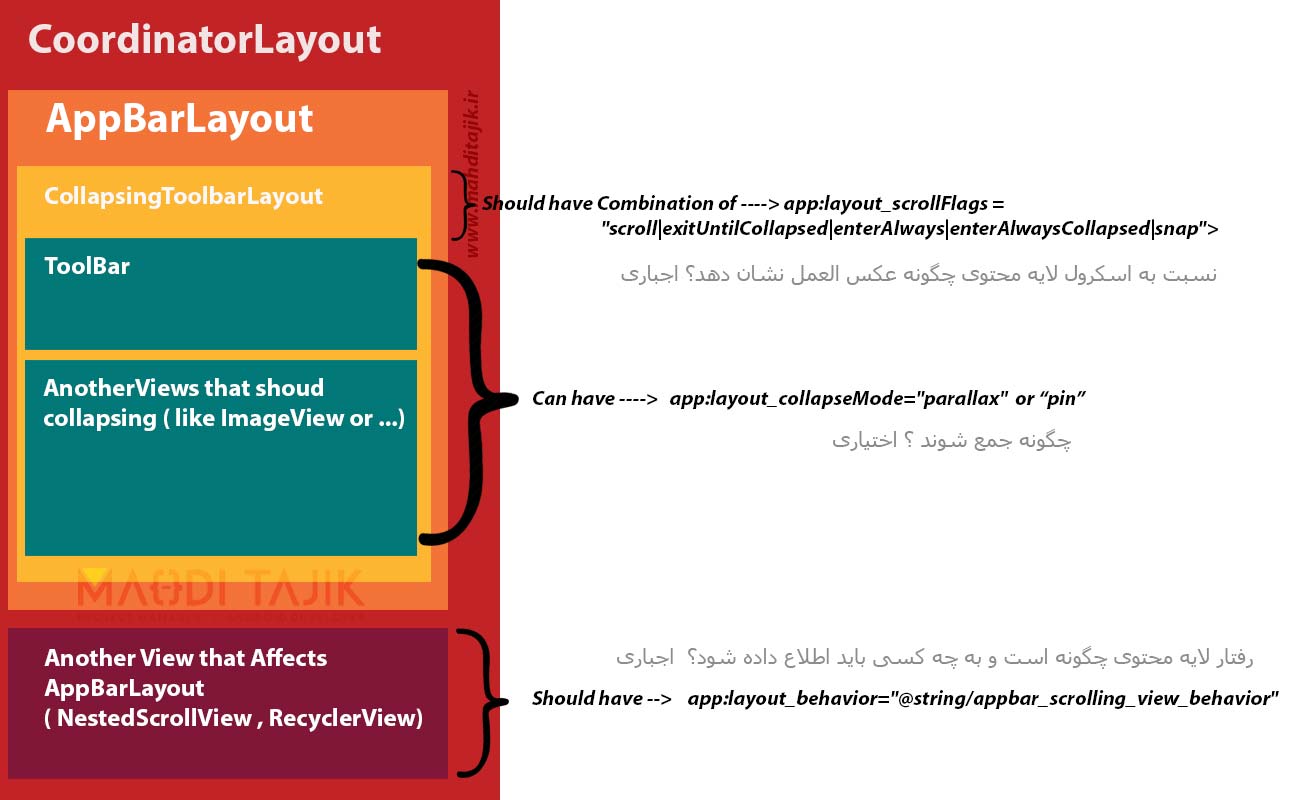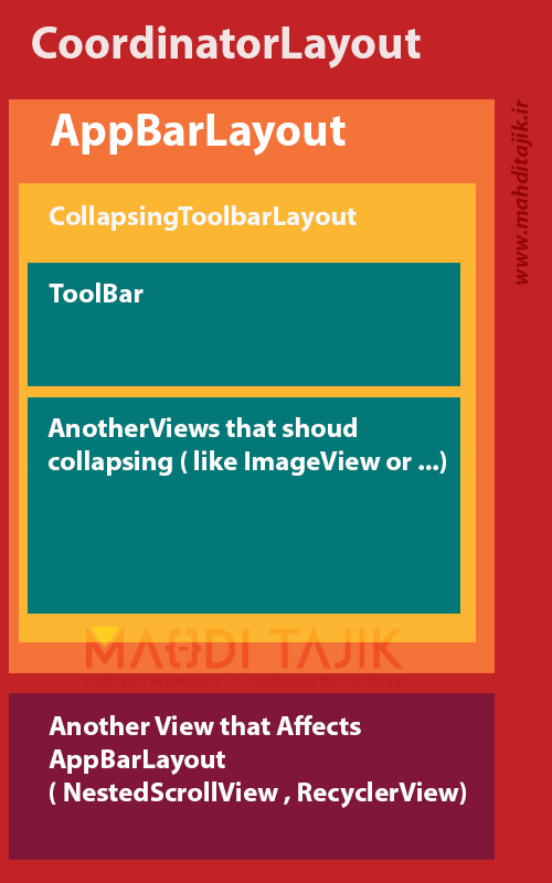CollapsingToolBar یک wrapper یا غلاف برای ToolBar هست که خودش مشتق شده از AppBar است و طراحی شده تا فرزند AppBarLayout باشد. خود AppBarLayout یک LinearLayout است با این امکان که اکثر افکت ها و امکانات Material Design در فرزند های آن قابل استفاده است و اجازه می دهد تا ToolBar و View های دیگر نسبت اسکرول شدن View های وابسته (NestedScrollView و یا RecyclerView) عکس العمل نشان بدهند و افکت های Material Design را اعمال کنند.حتماً می دانید که AppBarLayout باید والد یا parent آن CoordinatorLayout باشد. خود CoordinatoLayout نیز Super FrameLayout است که معمولا به عنوان والد اصلی لیوت ها بکار گرفته می شود. برای جلو گیری از پیچیده شدن مطلب به نمودار زیر توجه کنید: