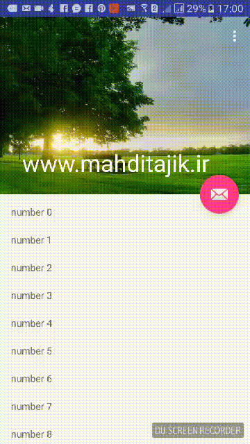 همانطور که می بینید با استفاده از کامپوننت های CollapsingToolBar و AppBarLayout و CoordinatorLayout با دادن چند Property ساده تونستیم افکت زیبای Material Design را داشته باشیم. امیدوارم این مقاله براتون مفید بوده باشه.